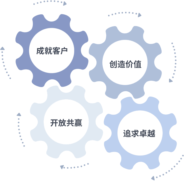成就客户是一切决策的出发点,,创造价值是衡量所有工作的标准,,,,追求卓越是我们做事做人的态度,,开放共赢是我们的格局也是最终的结果。。。价值观的齿轮环环相扣,,,推动着组织里的每个人不断向前。。。。