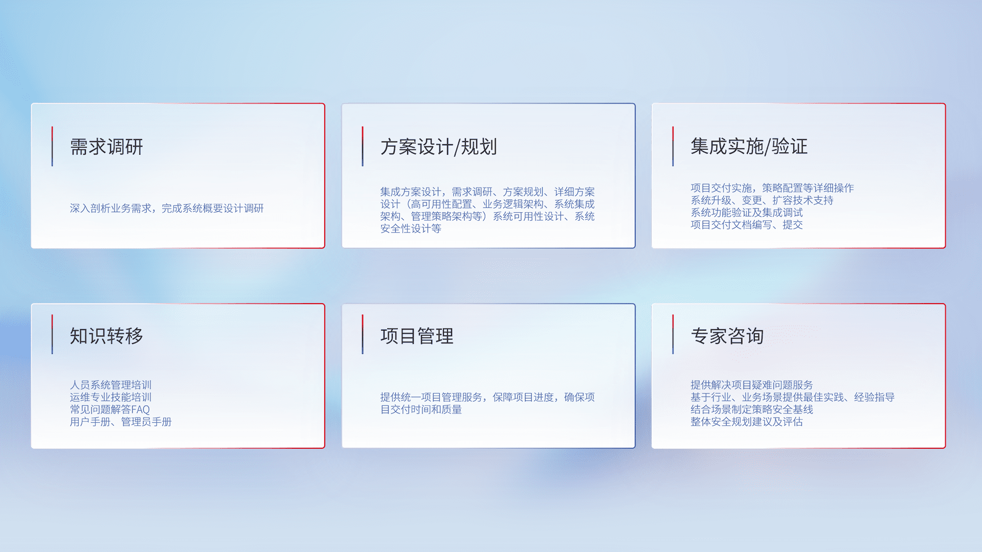 针对客户行业特性,,,将宏观的安全战略和需求,,通过专业的交付服务,,,,实现项目落地,,为客户提供标准规范的集成交付服务。。。。
